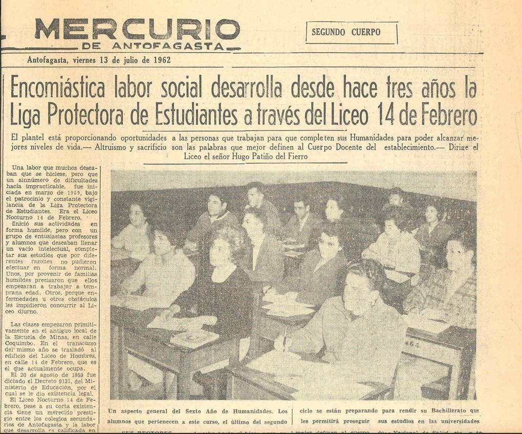 Bajo el patrocinio de Liga de Estudiantes y la dirección del Señor Hugo Patiño del Fierro nace el primer Liceo Nocturno “14 de Febrero”. Primitivamente las clases se iniciaron en el antiguo local de la Escuela de Minas, en calle Coquimbo, al poco andar se trasladaron al edificio del Liceo de Hombre en calle 14 de febrero. El 20 de agosto de 1959 fue dictado el Decreto 9131, del Ministerio de Educación, dándole existencia legal.